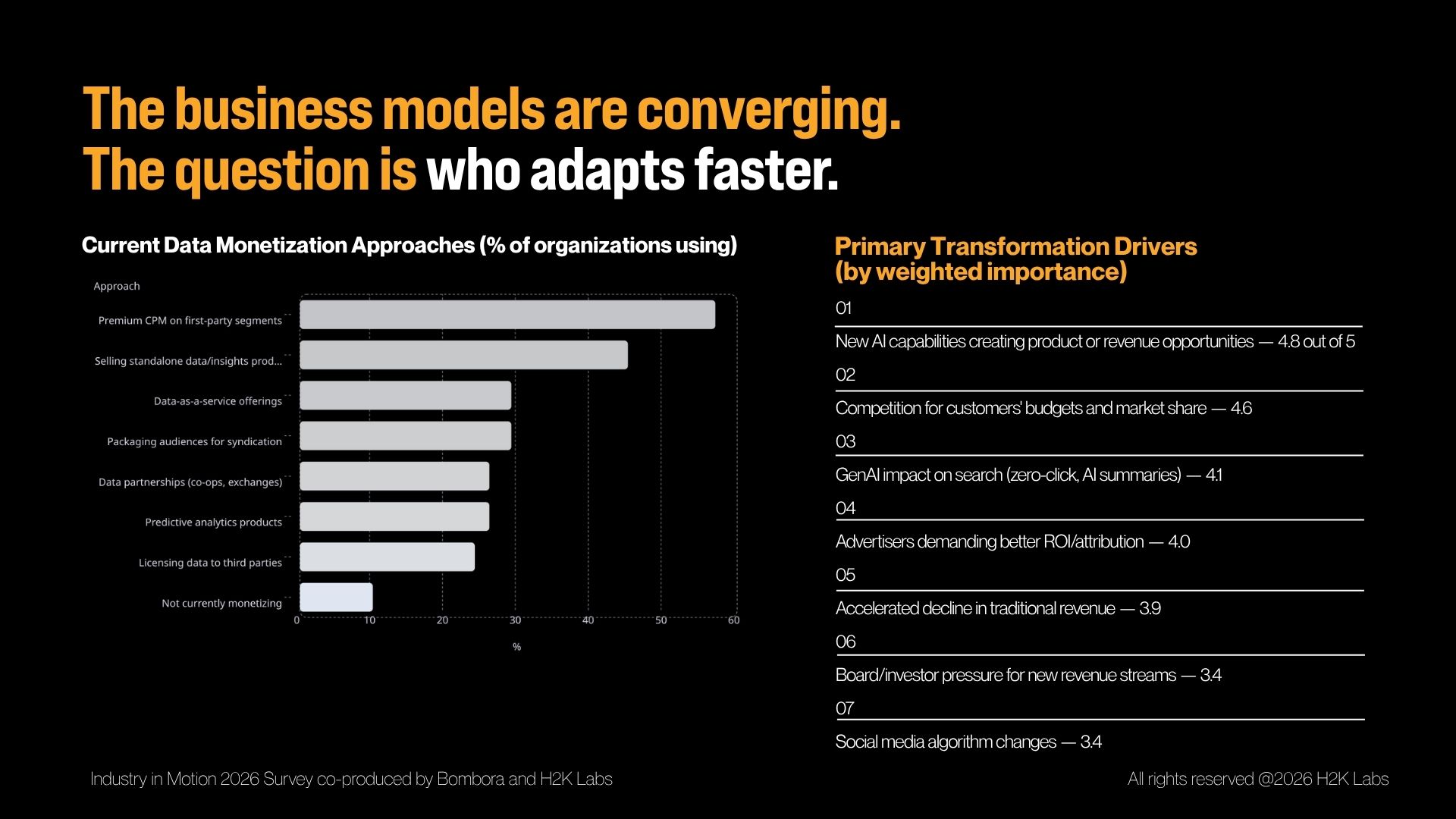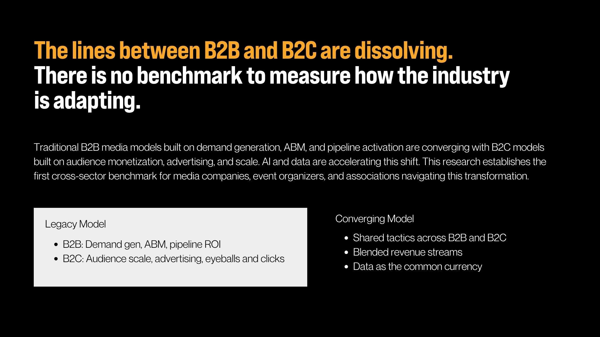 Jaime Schultheis, Head of Global Data Partnerships, Bombora, and I presented an early view into Industry in Motion: Benchmarking Media & Events in the Data & AI Era to show how these businesses are adapting as revenue models shift, AI accelerates change, and data becomes a larger commercial asset. The headline: ambition is outrunning capability.