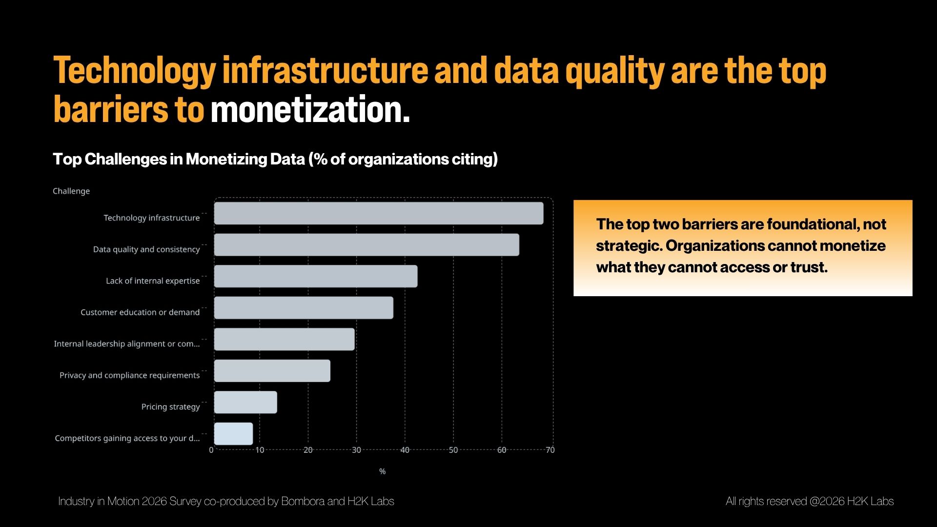 When leaders were asked what is blocking data monetization, the top issues were not demand or pricing. They were technology infrastructure, data quality and consistency, and structural constraints like legacy tech, budget limits, and lack of talent.