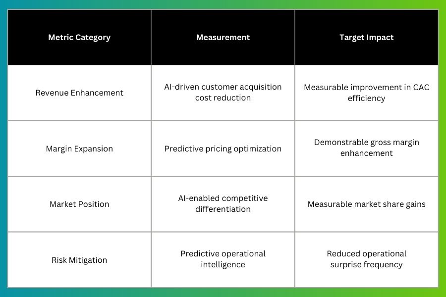 A: Track AI-driven revenue enhancement, margin expansion, competitive differentiation, and risk mitigation using specific KPIs that correlate with enterprise value multiples in your sector.