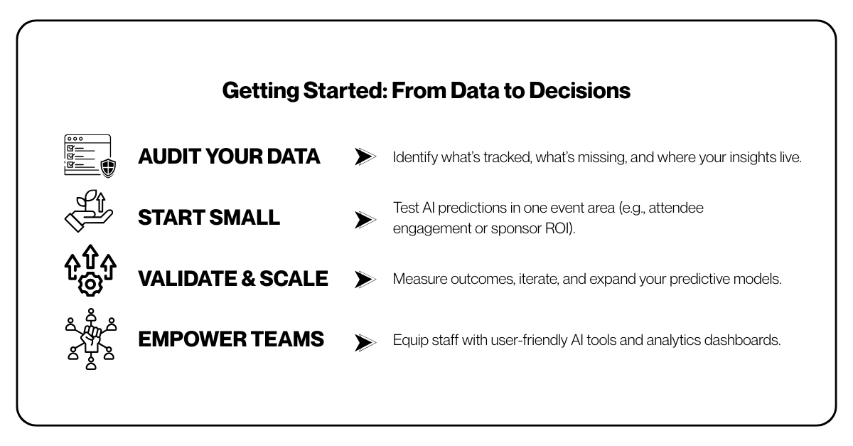 Building a future-ready event data ecosystem starts with a strong foundation of reliable, ethically sourced, and well-structured data. Every successful AI strategy relies on clean and connected datasets that integrate seamlessly across platforms — from CRMs and registration systems to engagement apps and analytics tools. Establishing unified KPIs and consistent event performance metrics ensures that insights are meaningful and comparable across events, while continuous feedback loops allow machine learning models to improve over time.