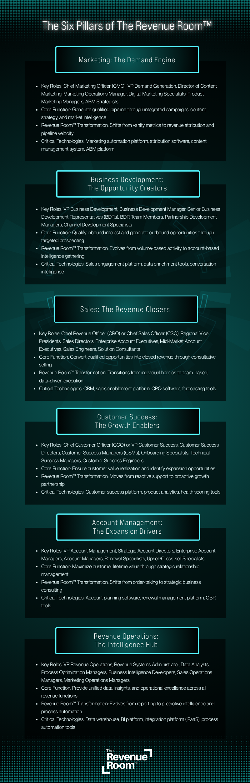 The Revenue Room™ represents a fundamental shift from traditional departmental structures to an interconnected revenue ecosystem. This construct aligns six critical functions—marketing, business development, sales, customer success, account management, and revenue operations—under a unified operating system with shared goals, integrated processes, and synchronized data flows.
